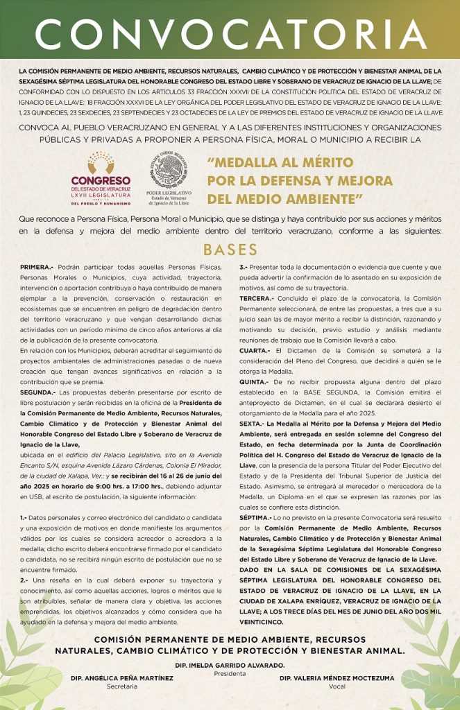 La Comisión Permanente de Medio Ambiente, Recursos Naturales, Cambio Climático y de Protección y Bienestar Animal de la LXVII Legislatura emitió la convocatoria para el otorgamiento de la medalla al Mérito por la Defensa y Mejora del Medio Ambiente 2025, distinción que entrega anualmente el Congreso del Estado para reconocer las acciones en favor del medio ambiente.
